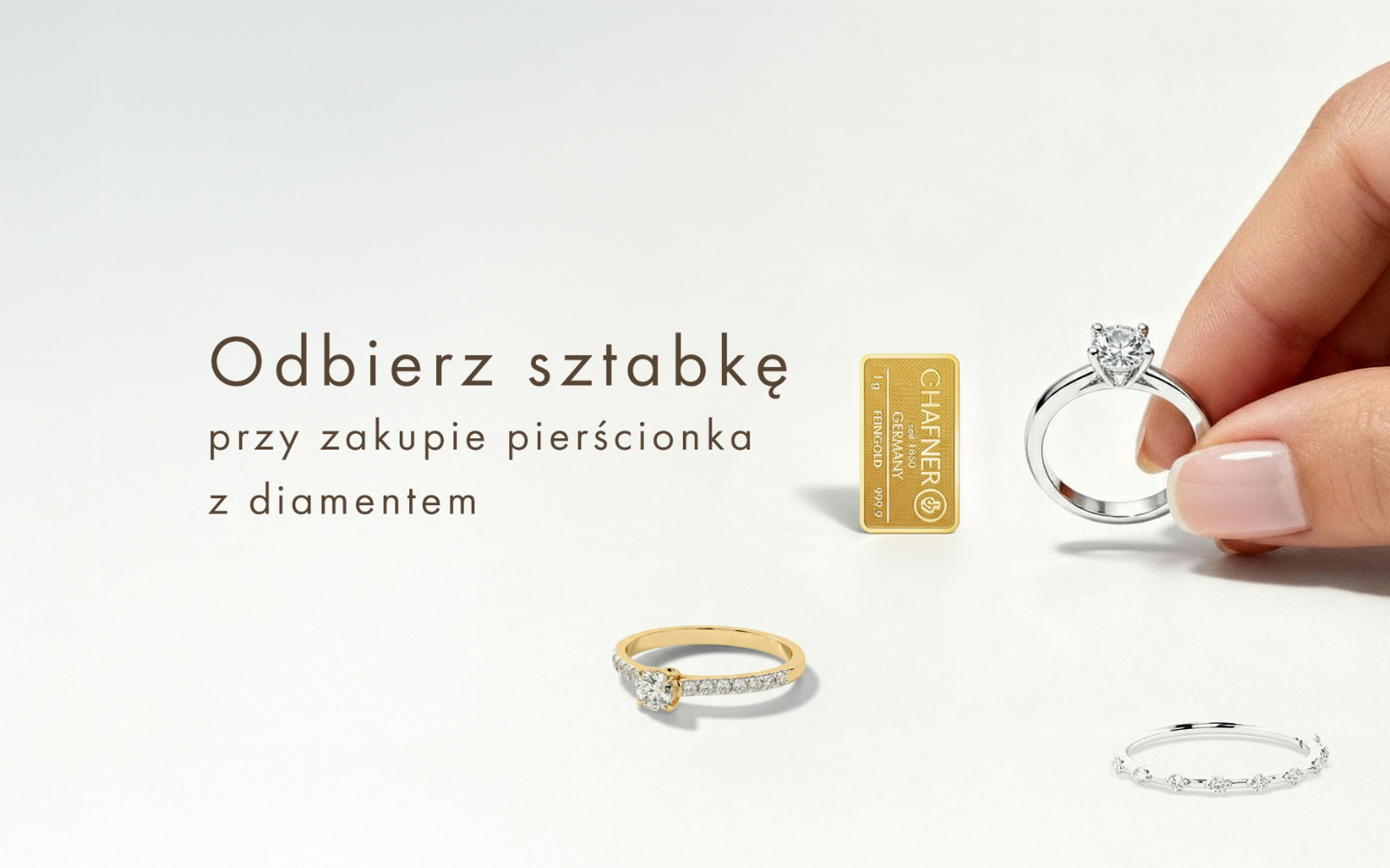 Do każdego pierścionka z diamentem o wartości do 2999 zł dodajemy złotą sztabkę o wadze 0,5 g, a przy zakupie pierścionka od 3000 zł – sztabkę o wadze 1 g. Producent sztabki wybierany jest losowo. Po spełnieniu warunków promocji złota sztabka zostanie dołączona do zamówienia, a jej pozycja będzie widoczna na dokumencie sprzedaży.